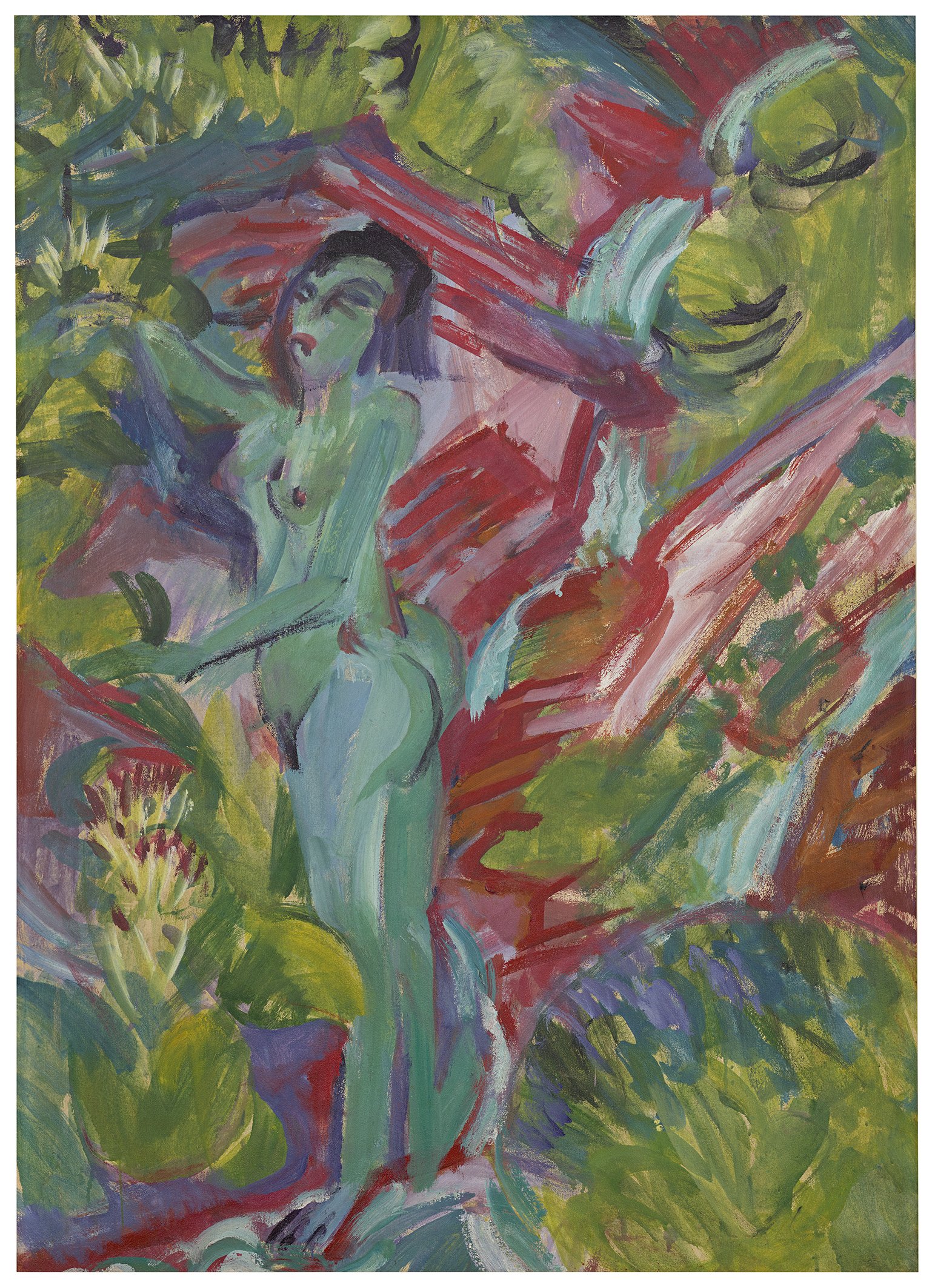 Nach seiner Krise begegnet Kirchner der Ausdruckstänzerin Nina Hard. Mit ihrer natürlichen, spontanen Bewegung inspiriert sie ihn zu einem neuen Frauenbild: vital, archaisch, ungebändigt. In Werken wie Nackte Frau an der Quellezeigt sich seine Suche nach einem "natürlichen Körper", fern der Nervosität der Großstadt.